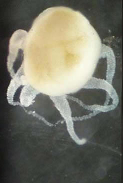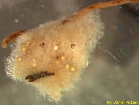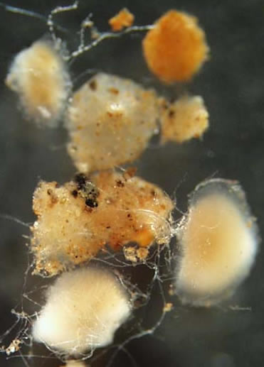 (Porifera - sponges) familiar sponge-like "colony" made up of many specialized cells; lack tentacles or other structures; range in appearance from large blanket crusts to finger-like projections; may see fuzzy-looking nodules in a sample |