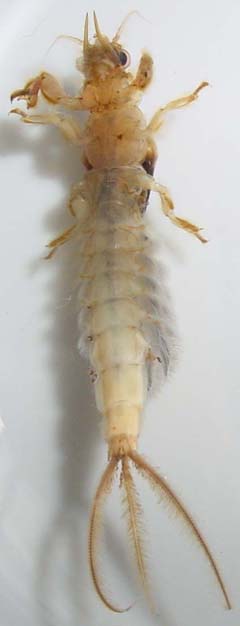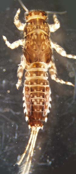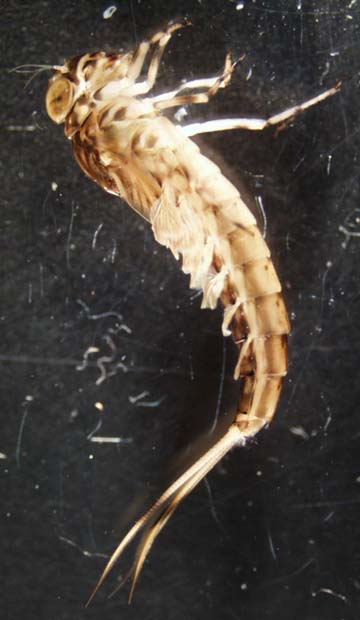 The name Ephemeroptera refers to the short-lived nature of the winged adult stages of mayflies. Mayflies are one of the more widely known macroinvertebrate groups, mostly because of their importance to fish diets and thus fly fishermen. In some parts of the country certain families (i.e., Ephemeridae) are well-known because of their spectacular mass emergence. These coordinated emergences can clutter the bridges and roads with mayfly bodies and make a mess of a passing car's windshield.