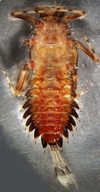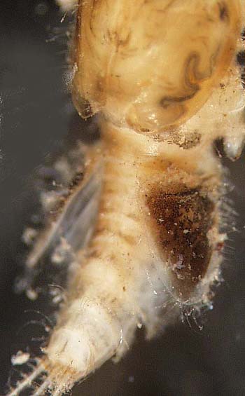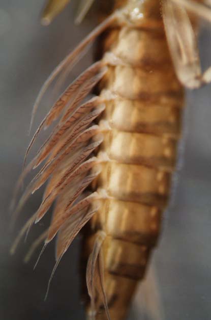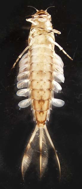 The abdominal gills of mayflies are one of the most distinguishing features of the group, and are usually prominent. All mayflies have flattened gills on their abdomen. These gills range from feathery to plate-like and are always present on at leat a few segments. You can watch some mayflies move their gills while they rest in a collection tray. The Ephemerellidae are noted for waving their round gills rapidly.