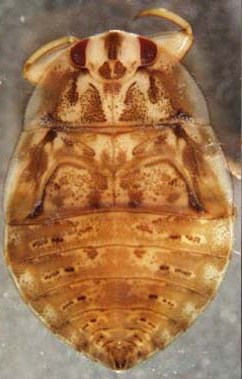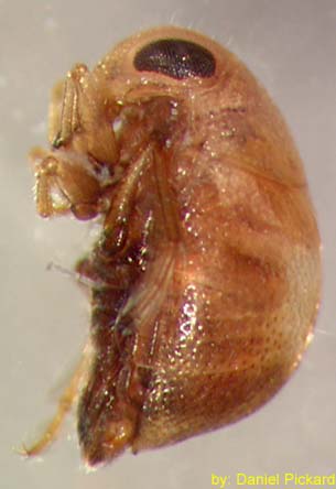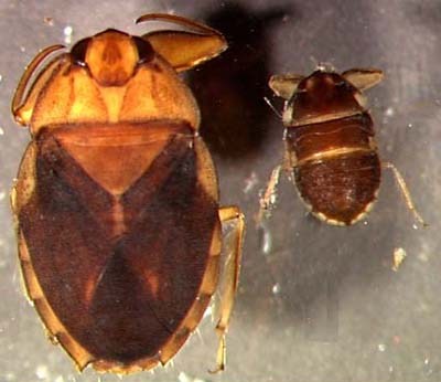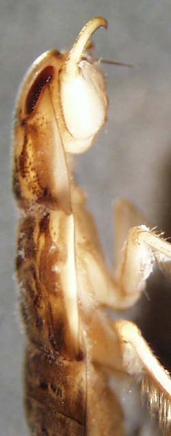 front legs are raptorial; body is short (6-9 mm), squat, and rather bumpy; the head is very short and wide, and the eyes protrude out to the sides; short inconspicuous antennae
