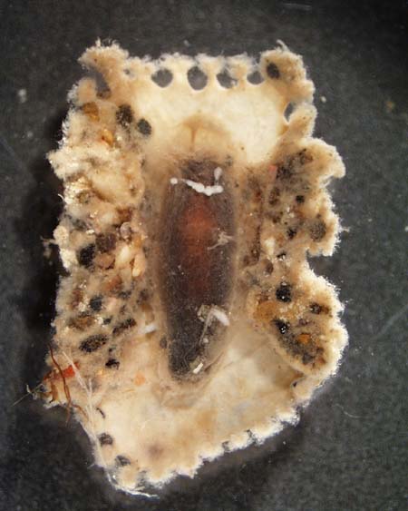 Adult Petrophila land on a rock, then crawl through the water to lay eggs. The larvae are well adapted for extracting oxygen from water, using clusters of finger-like gills on almost every segment of the body. They build tents from which they feed on nearby algae, then build a very tough covering to protect them while they pupate. These coverings look like yellowish scabs on rocky substrates in larger, fairly open streams and rivers. There are holes all around the edges to help move fresh, oxygenated water past the pupae.