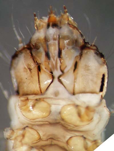 Identifying feature(s): many finger-like gills on abdomen and thorax; 6 short, hard legs on the thorax; 4 pairs of tiny prolegs under the abdomen