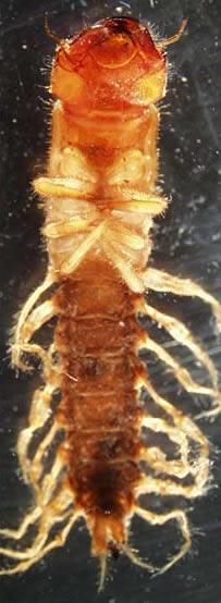 Corydalidae larvae are called hellgrammites; mature larvae can be surprisingly large (up to 90 mm). In the Northwest, they are typically found in rocky bottomed mountain streams. In the eastern US, these large predators can even be found in some urban streams. Corydalid larvae have long flattened bodies and robust toothed jaws. Hard plates cover the top of each throacic segment, and there are flexible gills on each abdominal segment. Unlike the alderflies, corydalid larvae have two short fleshy prolegs at the end of their abdomen; each proleg has 2 sharp hooks at the tip.
