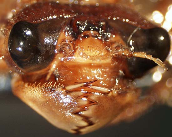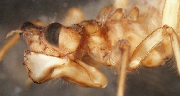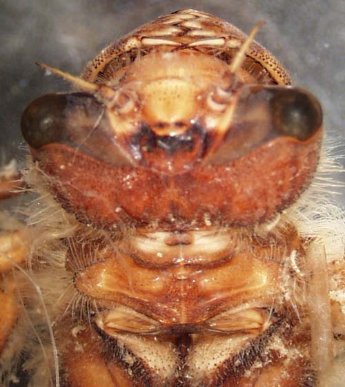 Identifying feature(s): large uneven teeth on margin of scoop-shaped labium; no horn on front of head