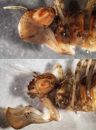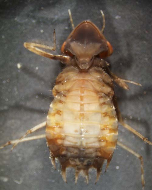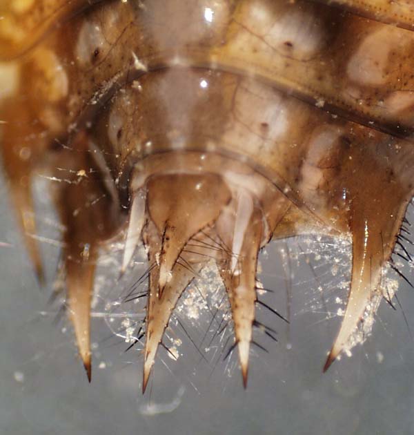 The Libellulidae are easily confused with the green eyed skimmers (Corduliidae). As is typical of dragonfly larvae, their body is thick with 5 relatively short points (no plates) at the end of the abdomen. Their labium is scoop shaped and covers much of the front of the head when at rest. The "pincers" or lobes of the labium usually don't have recognizable teeth as in the Cordullidae. If they do have recognizable, evenly sized teeth, they will have very long spines at the end of the abdomen. |