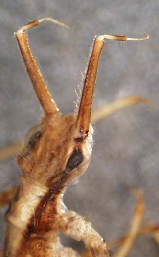 Identifying feature(s): long antennal base segments; middle plate at the tip of the abdomen is shorter than the two outer plates; labium with deep notch