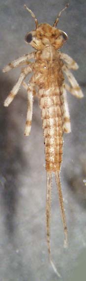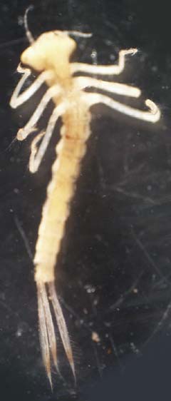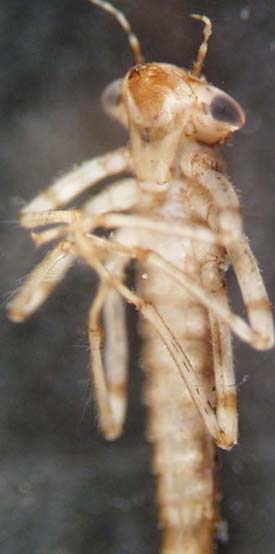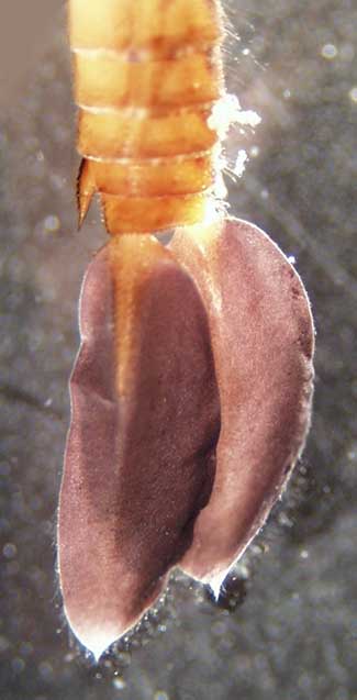 Coenagrionidae can be identified by ruling out the distinguishing characteristics of other families. All the segments of their antennae are about the same length (in contrast to the Calopterygidae, which have basal antennal segments longer than all the others combined), and they don't have the extremely long, narrow labium characteristic of Lestidae. The plates at the tip of the abdomen of Coenagrionidae are relatively broad and leaf-like. |