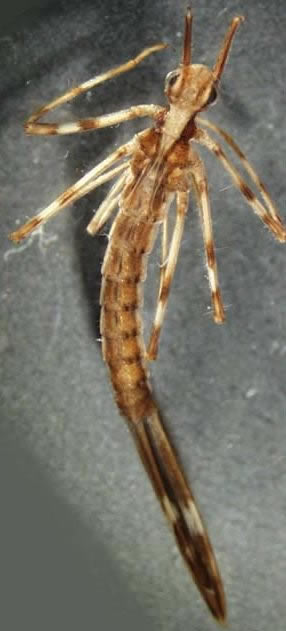 Dragonfly and damselfly larvae can be distinguished from all other macroinvertebrates by the highly modified labium described above. The labium is usually held pressed tight to the head, giving the face a mask-like appearance. To distinguish dragonflies from damselflies, look no further than the tip of their abdomens. Dragonfly larvae are stout bodied with a thick abdomen that ends in 3 to 5 short points. Damselfly larvae are usually long and thin with three flattened leaf-like plates at the tip of their abdomen. These plates may be used to extract oxygen from the water and as a rudder to help them hold their position in water.