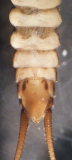 Mature larvae look similar to Nemourids (forestflies). As early instars, they resemble many other early instar stoneflies, but Taeniopterygidae can always be distinguished by either a triangular plate on the underside of the last two segments of the abdomen, or by segmented gills present at the bases of their legs. |