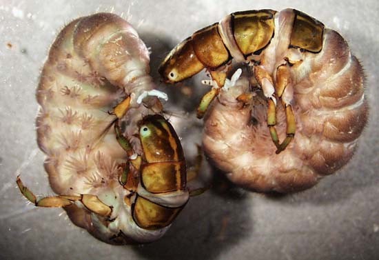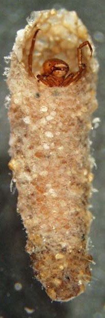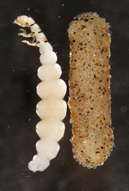 The shelters that most caddisflies build are probably the group's most remarkable feature. These cases may be stationary or portable, and are used for protection, feeding, and moving water past the gills. The shape and material of the cases often reflects the type of habitat in which they live - caddisfly bases may be built from sand grains or plant pieces, and may be tubular, square, or even coiled. One especially unusual genus (in the Helicopsychidae) was initially identified as a snail by the scientist who discovered it! The cases may also be quite colorful; one of the most famous Northwest caddisflies is the large black and orange October or fall caddisfly. Some common and successful caddisflies build a stationary shelter and construct complex silken nets to capture drifting organic debris and tiny invertebrates.