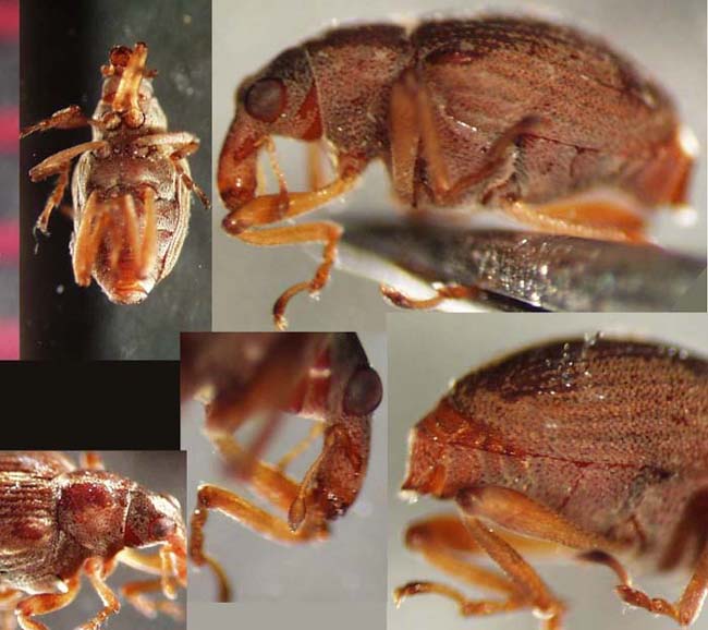 One species, Euhrychiopsis lecontei (see images below), has been considered as a possible biological control agent for the introduced and highly invasive Eurasian watermilfoil. The larvae of these weevils burrow into the stems of their milfoil host plants. Our native milfoils have a thick stem that can stand up to the burrowing, but the invasive milfoil has a narrower stem that breaks as the larva burrows. Research in the Pacific Northwest into this potential biological control has been conducted at the University of Washington School of Aquatic and Fishery Sciences. |