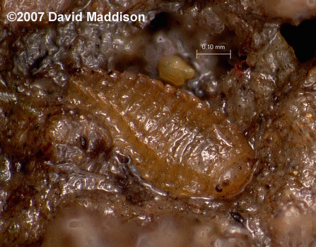 Slightly flattened head with mandibles clearly visible. The body is mostly soft with a wrinkled appearance. The abdomen ends in very short lobes; abdominal filaments may be present but hooks are absent. Antennae attach to the head between the mandibles.