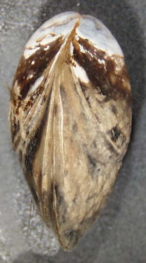 Identifying feature(s): sturdy triangular shell with a flat side, brown and white markings