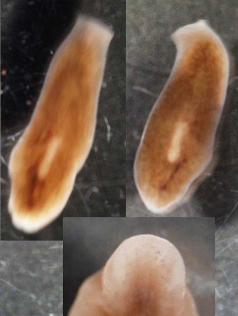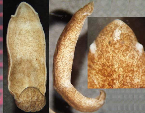 Identifying feature(s): soft,elongated, unsegmented bodies; 5-20 mm; strongly flalttened from top-to-bottom; anterior end often triangular; may have two "crosseyed" eyespots on top of head; no appendages; pale pharynx may be visible beneath or extended from body