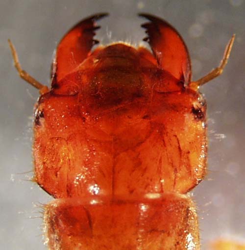 A diverse group; larvae and adults may be present in samples. Beetle larvae may be hard bodied, soft bodied with filaments on the abdomen, or white, legless grubs. Forewings of adults are modified into hard shield-like structures (elytra) that meet at the midline of the body but do not cross over each other. |