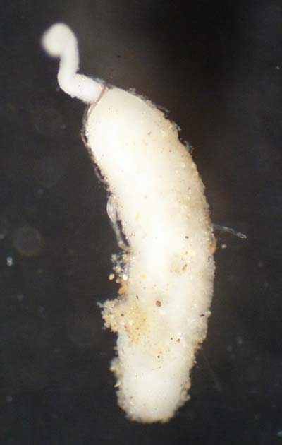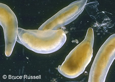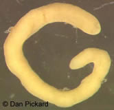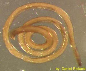 Small, unsegmented, worm-like organisms with tough bodies; usually white and sometimes poking out of another macroinvertebrate that they have parasitized |