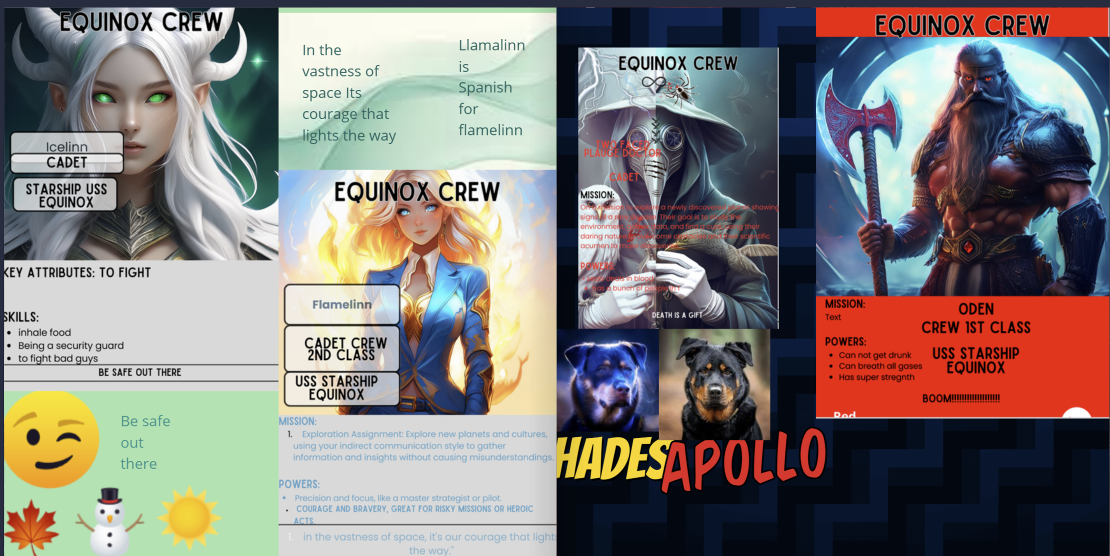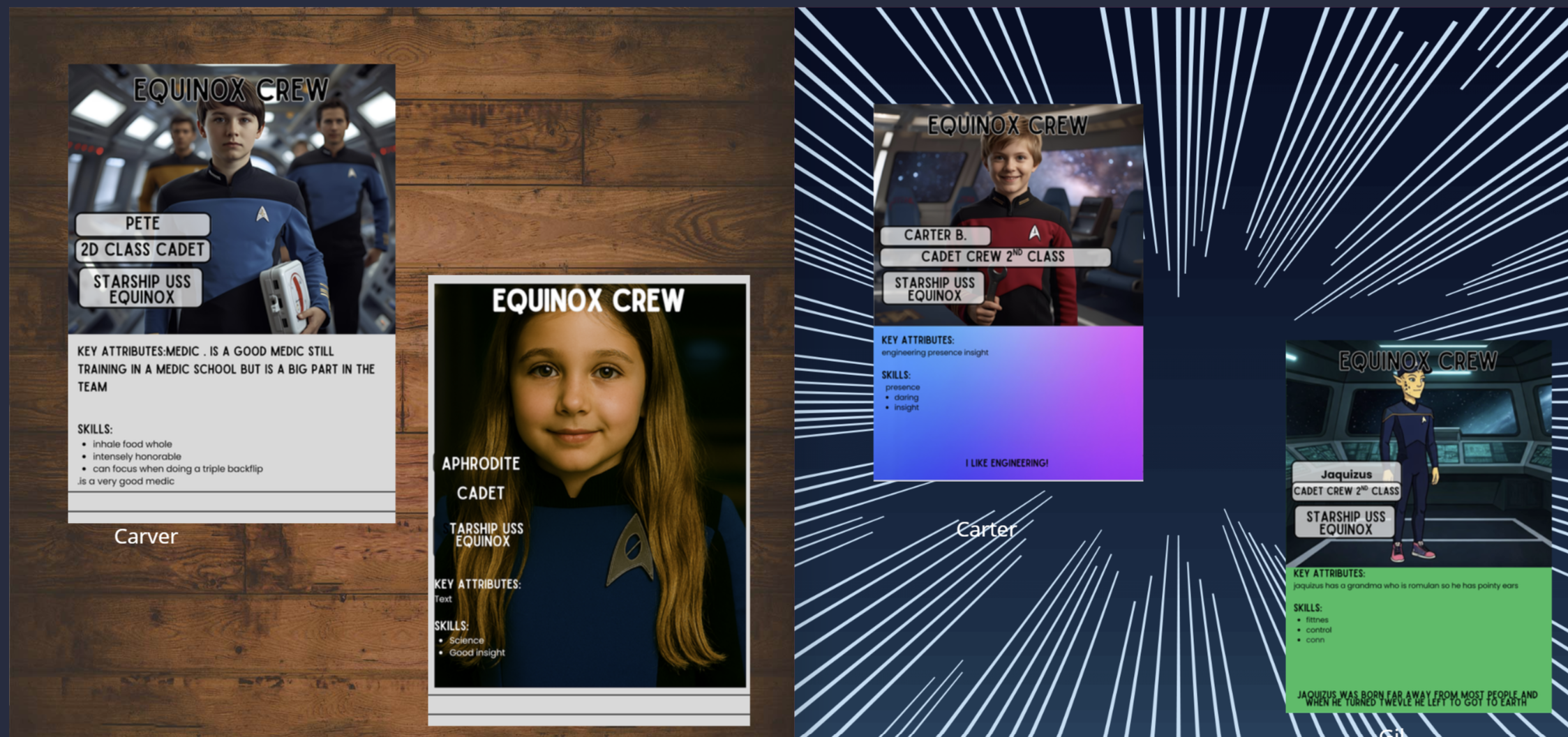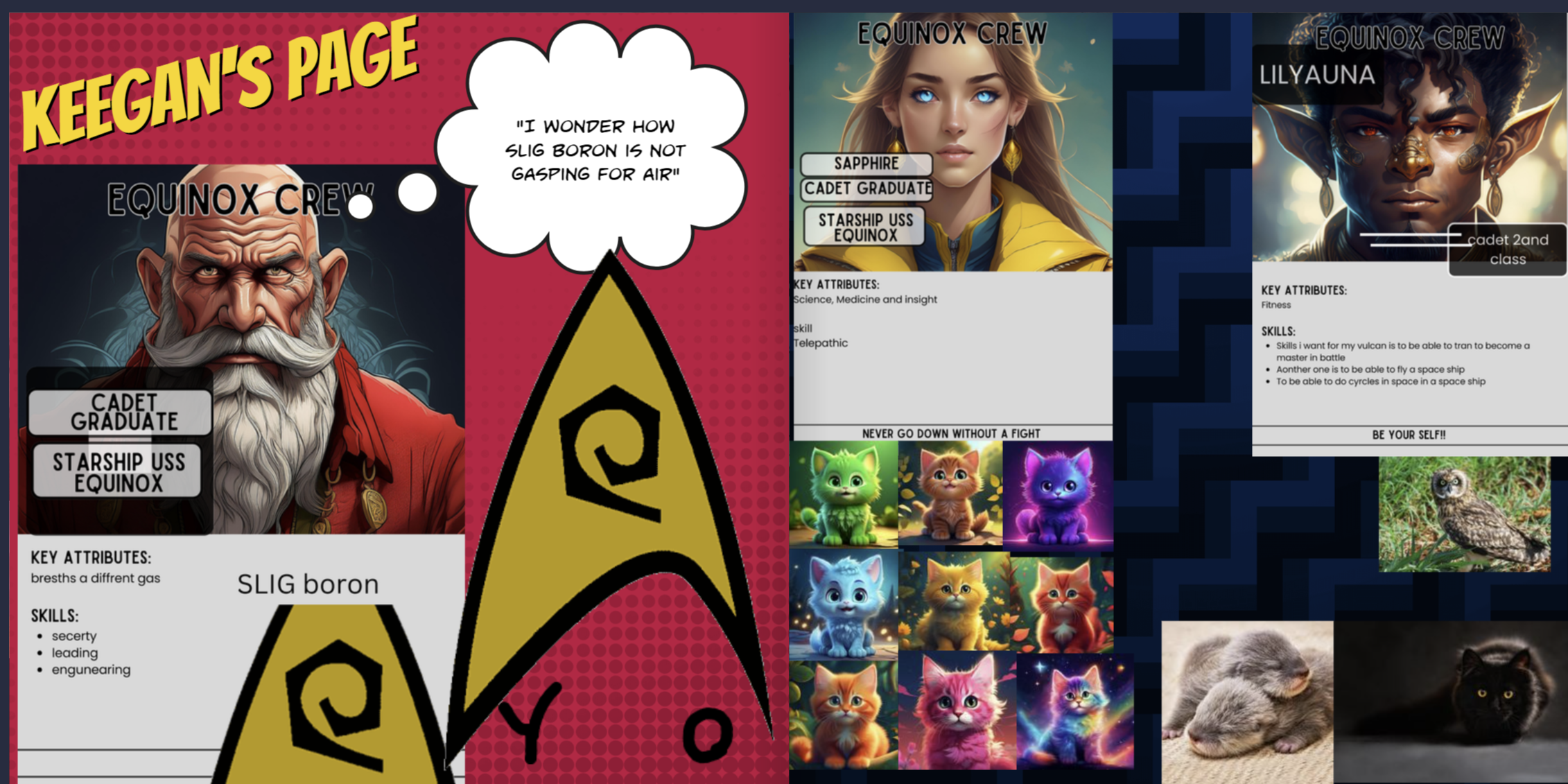 Last year students had to use Adobe Firefly to generate their images once they had enough information about their character from the School AI Space or from their own imagination. Firefly was great because it’s not trained on copyright images. Adobe trains Firefly on their vast library of images. While that is a strong point to using Firefly, it makes it difficult to generate images of copyright characters and alien species from a franchise such as Star Trek! Looking at the sample pages above shows the most unique Star Trek crew that looks nothing like Starfleet or even Star Trek! Let’s just say that students struggled to write prompts that generated people looking close to any Star Trek alien species. Some kids went way off script!
