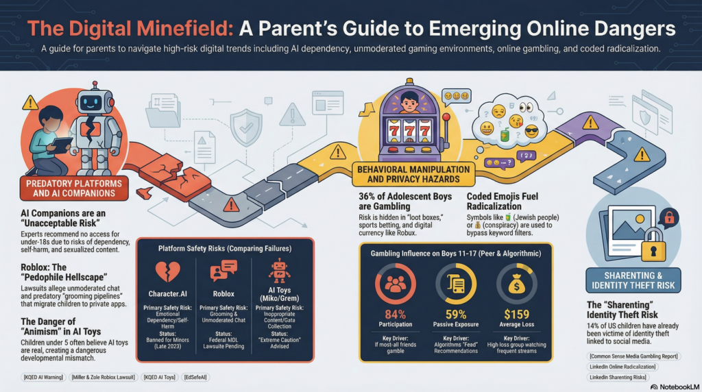 Serious tone to guide parents warning them of dangers their children might face online. Focus on the following categories: AI Companions and Toys, CharacterAI and Roblox as Dangerous and Unsafe, online gambling for boys, sharing digital images, and Online Radicalization and the use of Emojis.
